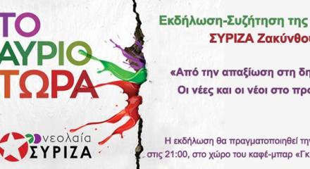 «Από την απαξίωση στη δημιουργία. Οι νέες και οι νέοι στο προσκήνιο» Εκδήλωση-Συζήτηση της Νεολαίας ΣΥΡΙΖΑ Ζακύνθου με τους υποψήφιους βουλευτές, Κοντονή Σταύρο δικηγόρο βουλευτή Ζακύνθου, Μυλωνα Αθηνά Λογίστρια και Πέττα Δημήτρη οικονομολόγο. Τρίτη 20/1, στις 21:00, στο χώρο του καφέ-μπαρ «Γκρέκο»