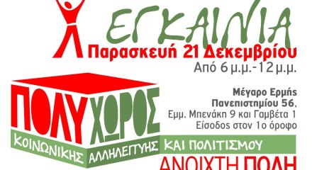 Ο Πολυχώρος Κοινωνικής Αλληλεγγύης και Πολιτισμού της ΑΝΟΙΧΤΗΣ ΠΟΛΗΣ άνοιξε με την παρουσία πλήθους κόσμου. Το left.gr κατέγραψε τα εγκαίνια. Τα εγκαίνια του Πολυχώρου έγιναν χθες, Παρασκευή 21/12, στο Μέγαρο Ερμής – Πανεπιστημίου 56, Εμμ. Μπενάκη 9 και Γαμβέτα 1, είσοδος στον 1ο όροφο. Μερικές ακόμα φωτογραφίες: Ο Πολυχώρος oργανώνεται σε δύο τομείς: ΤΟΜΕΑΣ 1: … Συνέχεια