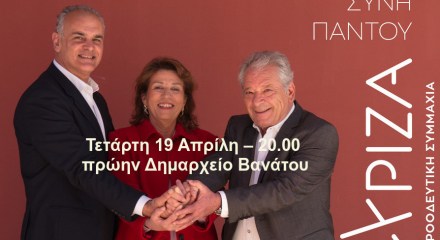 Το Σάββατο στις 22/4 στις 8 μμ στο πνευματικό κέντρο θά γίνει η παρουσίαση του ψηφοδελτίου του ΣΥΡΙΖΑ -ΠΣ Για να μπορεί η Ελλάδα να γίνει η χώρα που μας αξίζει, για να μπορούν τα παιδιά μας να αρχίσουν να ονειρεύονται και για να μπορούμε όλοι μας να ζήσουμε με δικαιοσύνη.