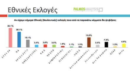 Προβάδισμα 5 μονάδων του ΣΥΡΙΖΑ σε δημοσκόπηση της Palmos Analysis για το tvxs.gr
