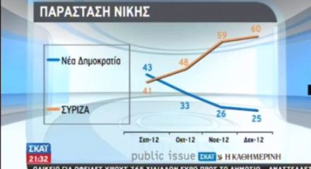 Ημερομηνία: 13/12/2012 Το κοινωνικό κλίμα, τη δυναμική των κομμάτων αλλά και την πρόθεση ψήφου, παρουσιάζει το Βαρόμετρο Δεκεμβρίου της Public Issue για τον ΣΚΑΪ και την Καθημερινή. Στην παράσταση νίκης πρώτος έρχεται ο ΣΥΡΙΖΑ με 60%, ποσοστό αυξημένο κατά μια μονάδα (59%) από τον προηγούμενο μήνα, αλλά αυξημένο κατά 19 από τον Σεπτέμβριο (41%) και … Συνέχεια